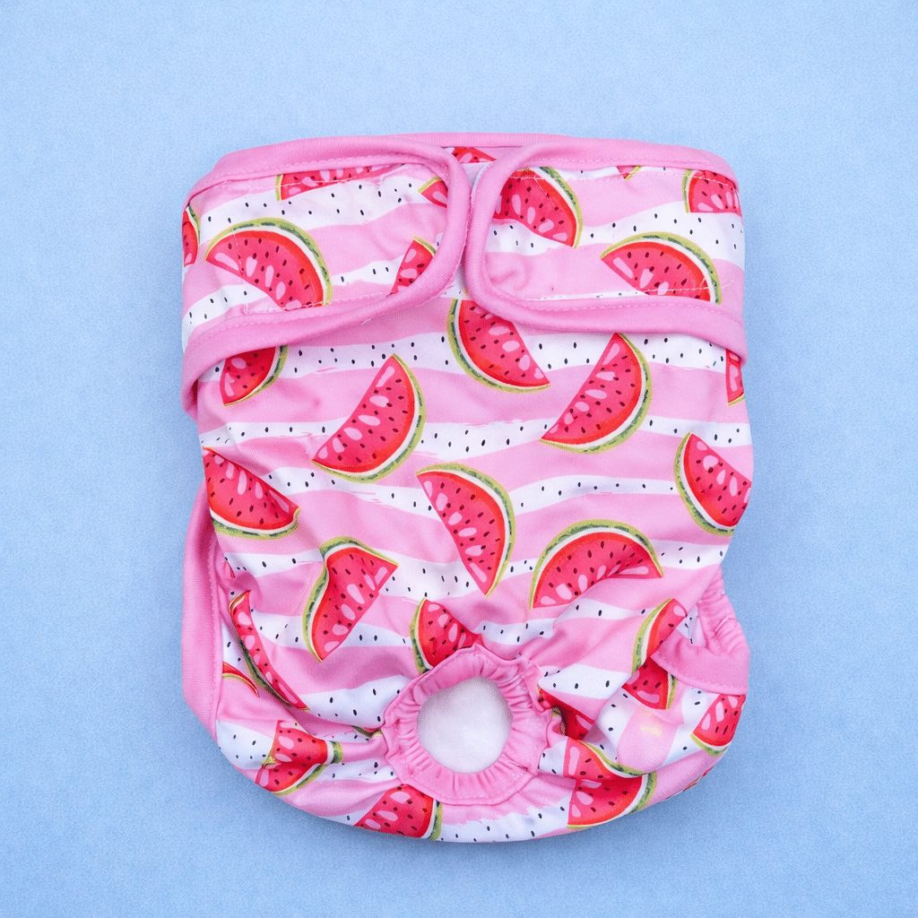 Le motif pastèque adorable transforme ces couches en un accessoire à la fois pratique et plein de charme pour votre chienne. Les sangles ajustables roses permettent un maintien parfait autour du ventre et des pattes arrière, garantissant que la protection reste bien en place pendant tous les mouvements de votre compagne.