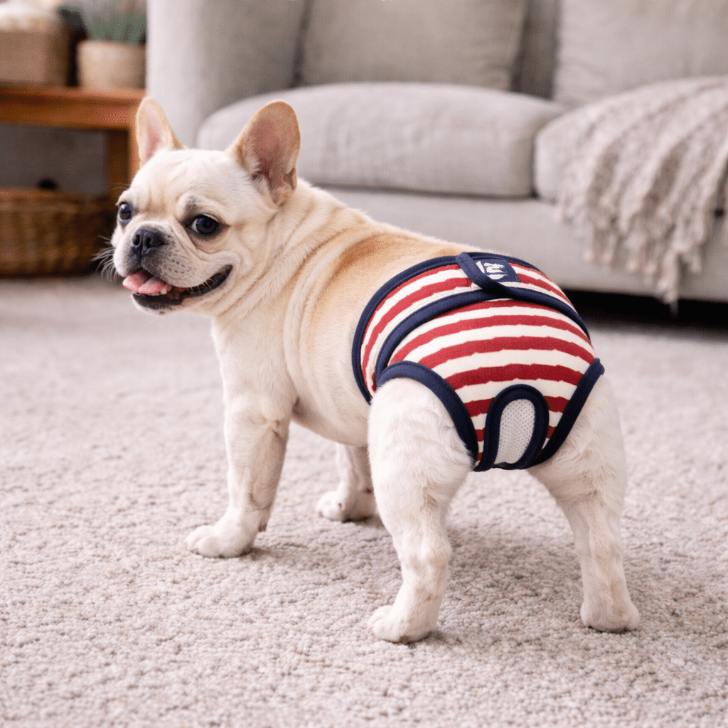 La fermeture velcro ajustable au niveau de la taille permet un maintien sécurisé tout en facilitant l’enfilage pour le maître. Votre chienne peut bouger librement sans que la culotte ne glisse ou ne la gêne dans ses mouvements.