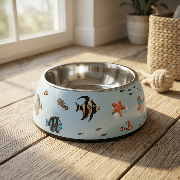 Cette gamelle chien : inox motif poisson présente un design aquatique ludique avec des poissons tropicaux colorés, des étoiles de mer et des hippocampes qui égayent l’heure du repas.