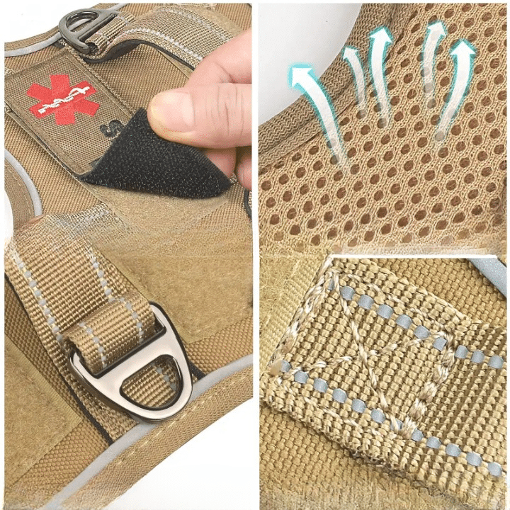 Ce harnais mama says présente une conception tactique moderne qui assure une répartition optimale de la pression sur le poitrail de votre petit compagnon. Les sangles ajustables multiples permettent un ajustement personnalisé qui épouse parfaitement la morphologie de votre chien.