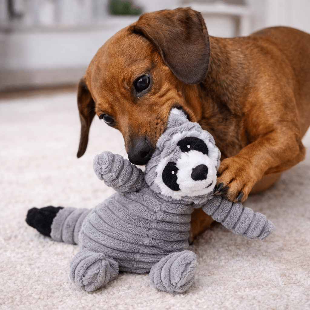 La face adorable du raton laveur avec son masque noir caractéristique et ses petites oreilles rondes capte immédiatement l’attention des chiens. Cette conception réaliste éveille leur instinct de jeu naturel et maintient leur intérêt plus longtemps.
