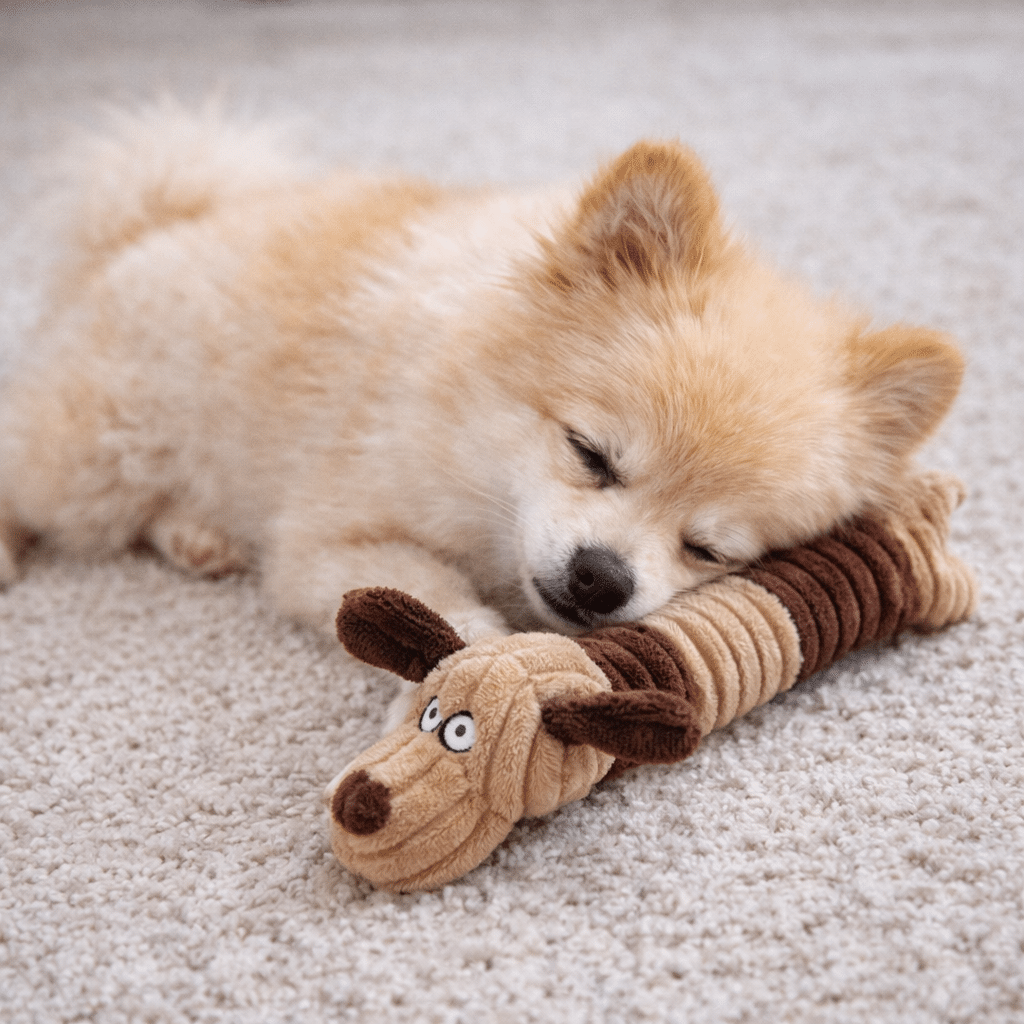 La forme allongée en accordéon de ce jouet à mâcher en peluche marron et beige offre une prise parfaite pour les petites mâchoires de votre compagnon. Les plis réguliers et texturés stimulent les gencives pendant la mastication et procurent un massage naturel qui apaise votre chien.