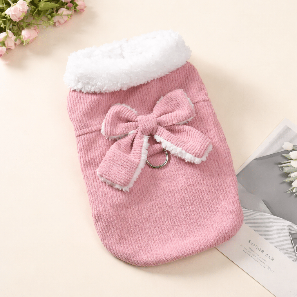 L’élément central de ce vêtement est son magnifique nœud décoratif qui apporte une touche d’élégance tout en intégrant discrètement un anneau métallique robuste pour fixer la laisse. Cette conception ingénieuse permet de promener votre chien sans harnais supplémentaire, simplifiant vos sorties quotidiennes.