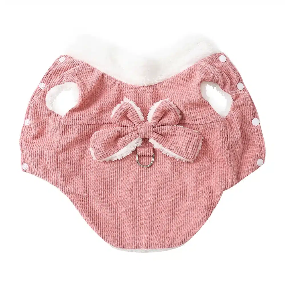 Ce manteau chaud avec noeud et crochet rose chihuahua offre une protection optimale contre le froid grâce à sa conception enveloppante qui couvre parfaitement le dos et les flancs de votre petit compagnon. Le col blanc remonté protège efficacement le cou des courants d’air froids, créant une barrière supplémentaire contre les intempéries.