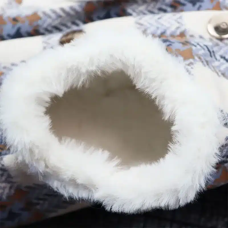 Les boutons dorés permettent un ajustement facile et sécurisé sur le devant, tandis que le système de fermeture pratique facilite l’habillage même avec les chiens les plus remuants. Le col montant fourré apporte une chaleur supplémentaire au niveau du cou, zone particulièrement sensible au froid.