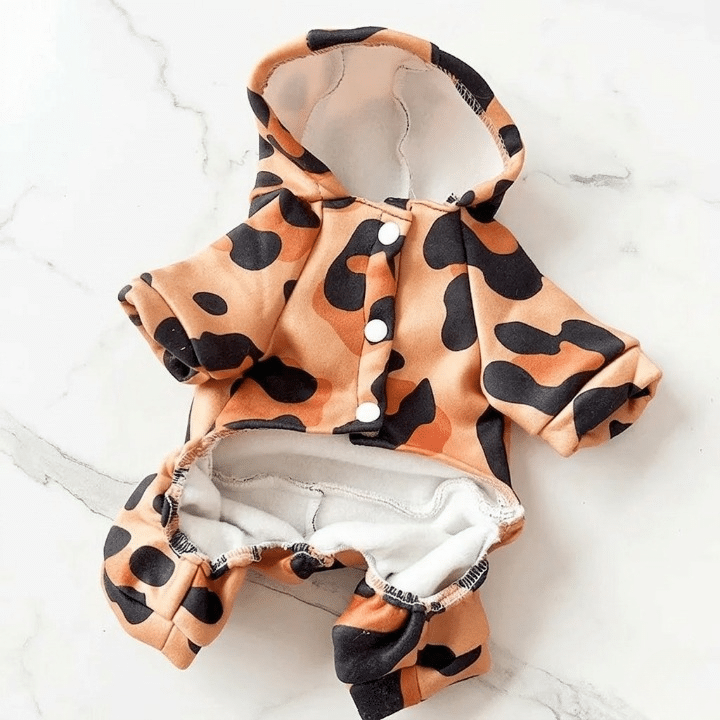 Les pattes entièrement couvertes du manteau léopard capuche petit chien évitent le contact direct avec le sol froid et humide.