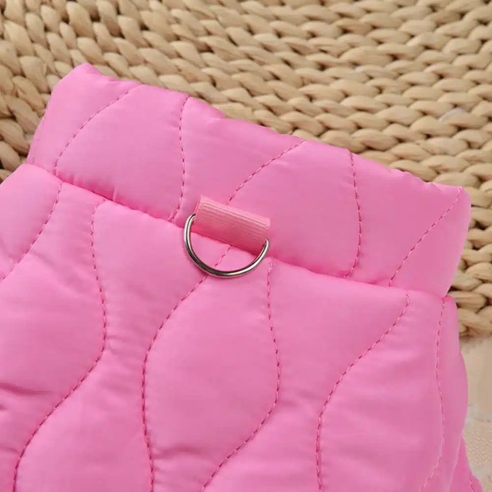 Le col montant protège efficacement le cou et la gorge des courants d’air froids. Les finitions soignées résistent aux lavages répétés, garantissant une durabilité dans le temps. Ce manteau matelassé petit chien intègre un anneau de fixation pour attacher directement la laisse, éliminant le besoin d’un harnais supplémentaire.