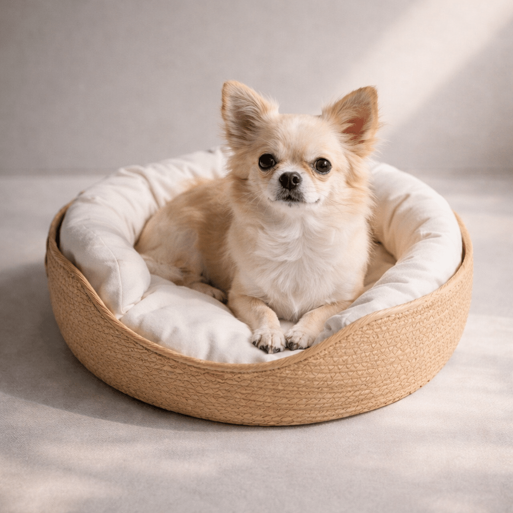 Le panier en rotin et bambou pour petit chien combine style et confort.