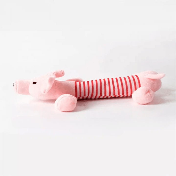Cette peluche cochon long pour chien présente une forme allongée parfaite pour les séances de jeu et de câlins. Son design adorable avec des petites pattes rondes et une tête de cochon souriante apporte une touche de fantaisie qui plaira autant à votre compagnon qu’à vous.