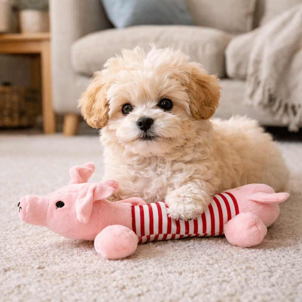 Excellent jouet ! Mon chien l’adore depuis le premier jour. La forme allongée est parfaite pour les jeux de traction et il peut la secouer dans tous les sens. Le couinement n’est pas trop fort, ce qui est appréciable pour les oreilles. Malgré les séances de jeu intensives, elle tient bien le coup après 2 mois d’utilisation. Le cochon est devenu son compagnon préféré, il dort même avec parfois. Je recommande pour les chiens qui aiment les peluches !