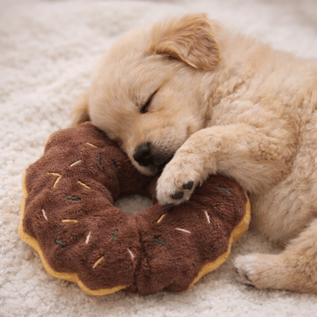 Cette peluche donut chocolat reproduit fidèlement l’apparence d’un vrai beignet avec son glaçage chocolat réaliste et ses vermicelles colorés dispersés sur toute la surface. Le trou central caractéristique permet à votre chien de saisir facilement le jouet et de le transporter partout dans la maison.