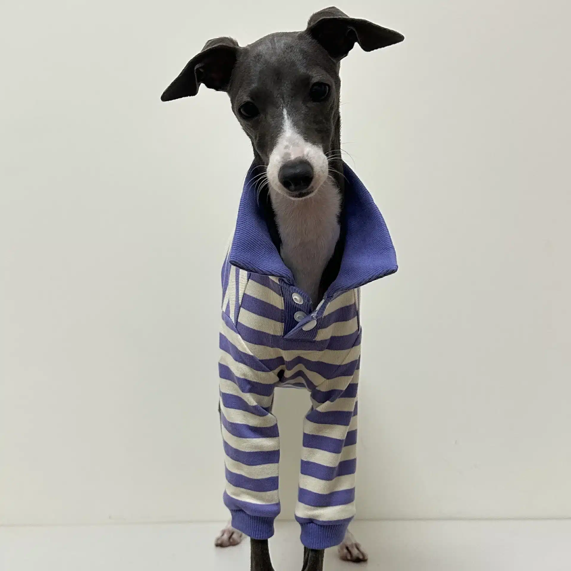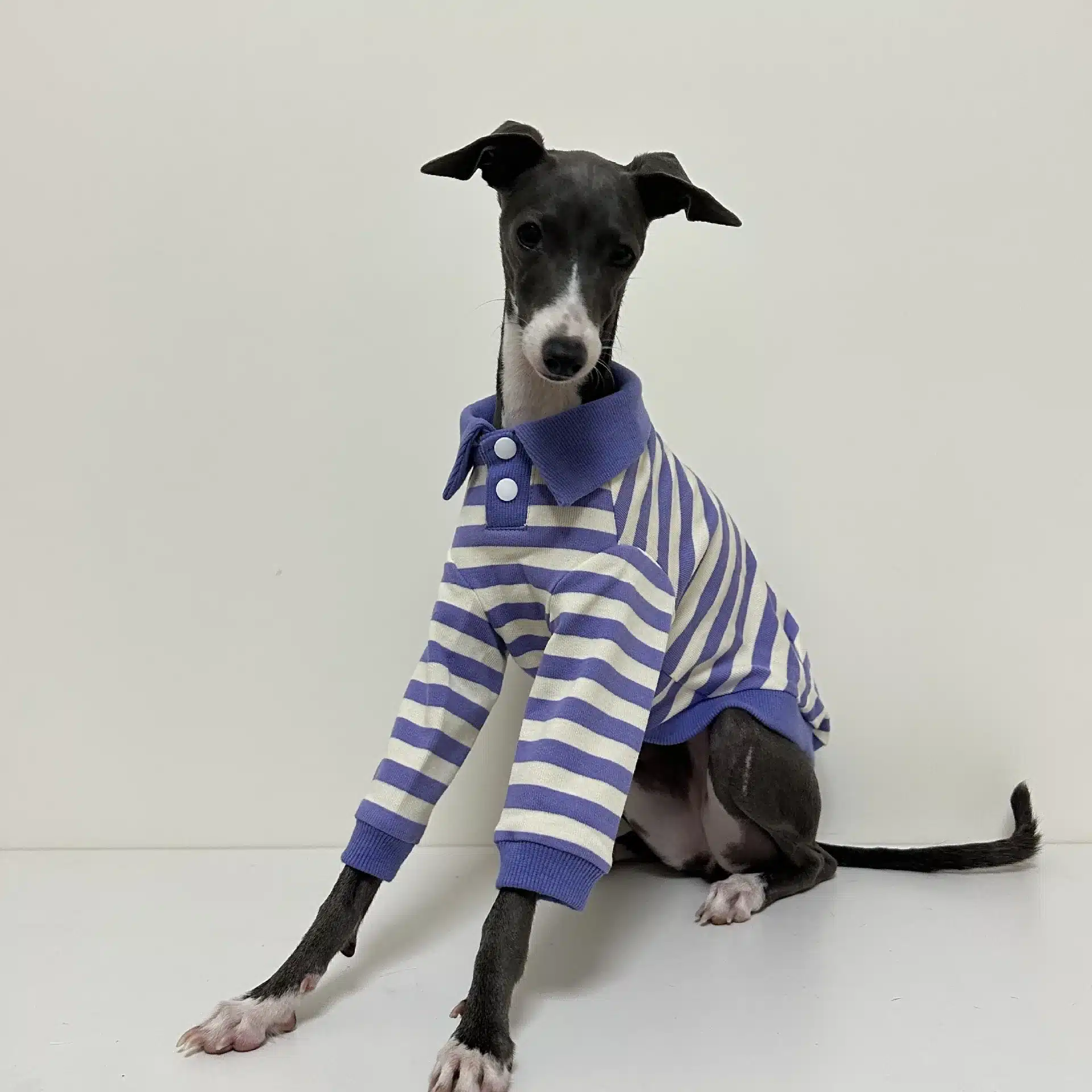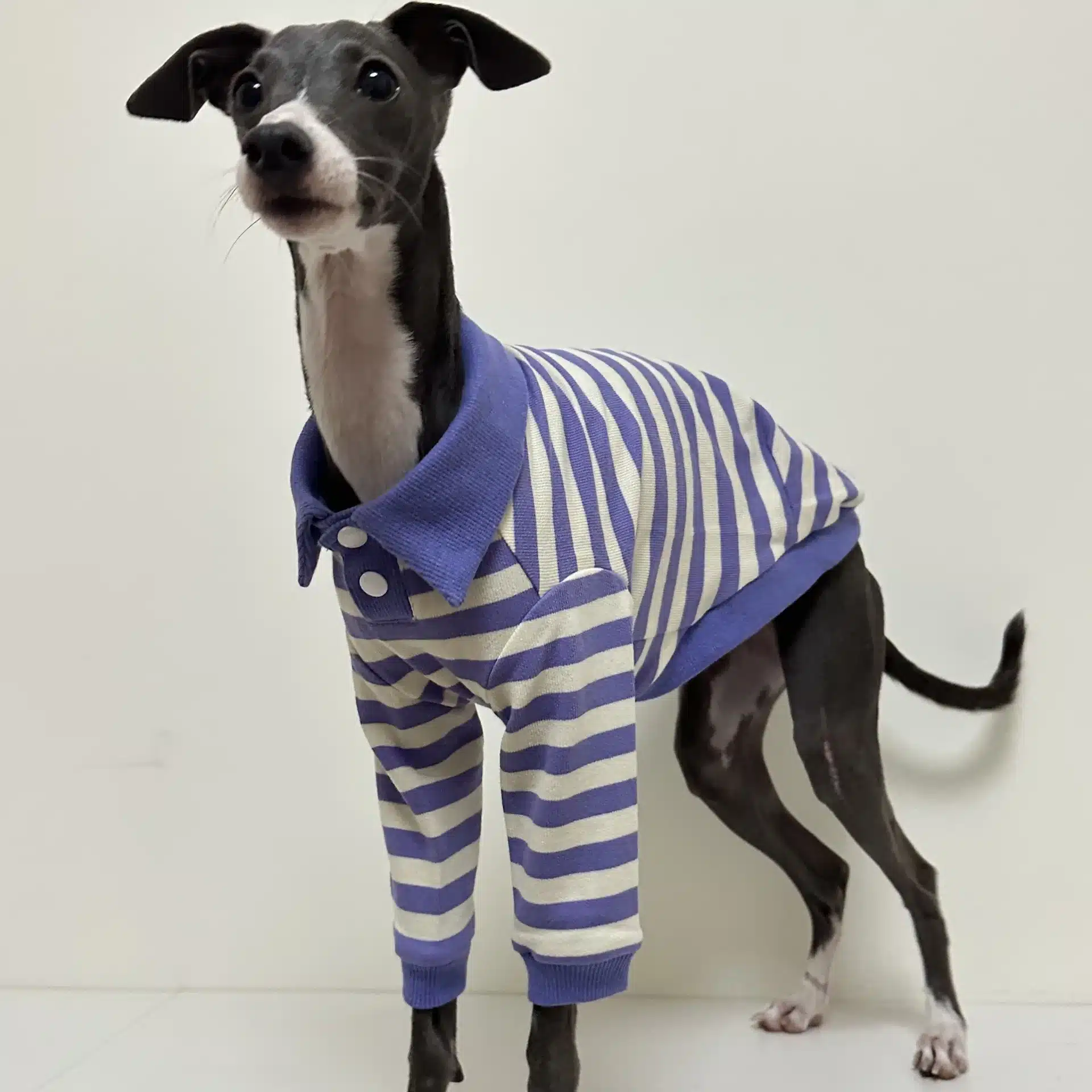 La coupe ajustée au niveau du torse suit naturellement les mouvements de votre lévrier sans entraver sa liberté de mouvement. Ce polo rayé pour lévrier respecte la morphologie particulière de cette race avec un ajustement qui épouse parfaitement le poitrail développé et la taille fine.
