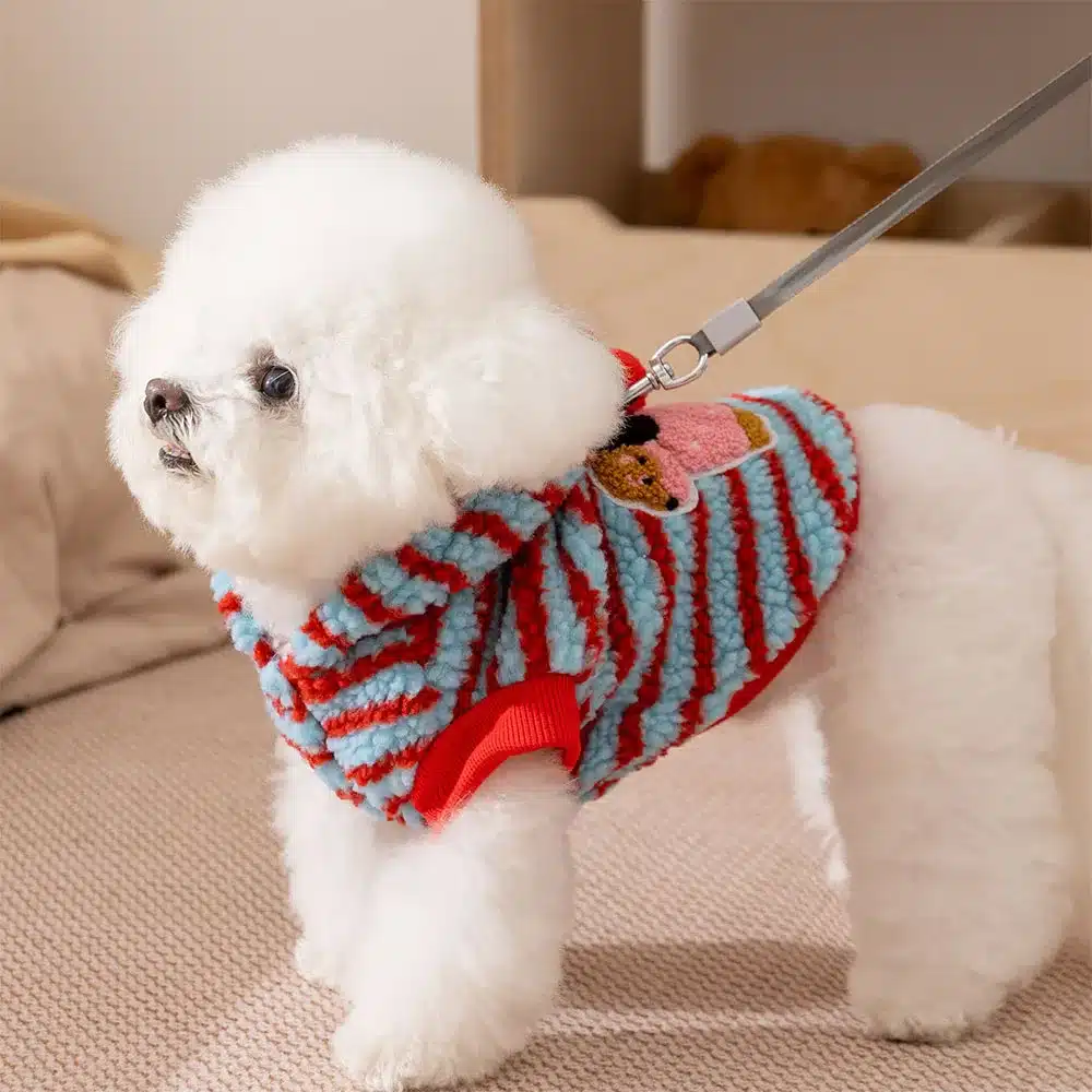 Ce pull avec pompon rayé pour petit chien offre une protection optimale contre le froid grâce à sa conception enveloppante qui couvre parfaitement le dos et le ventre de votre compagnon. Le motif rayé contrasté apporte une touche d’élégance qui transforme chaque promenade en défilé de mode.