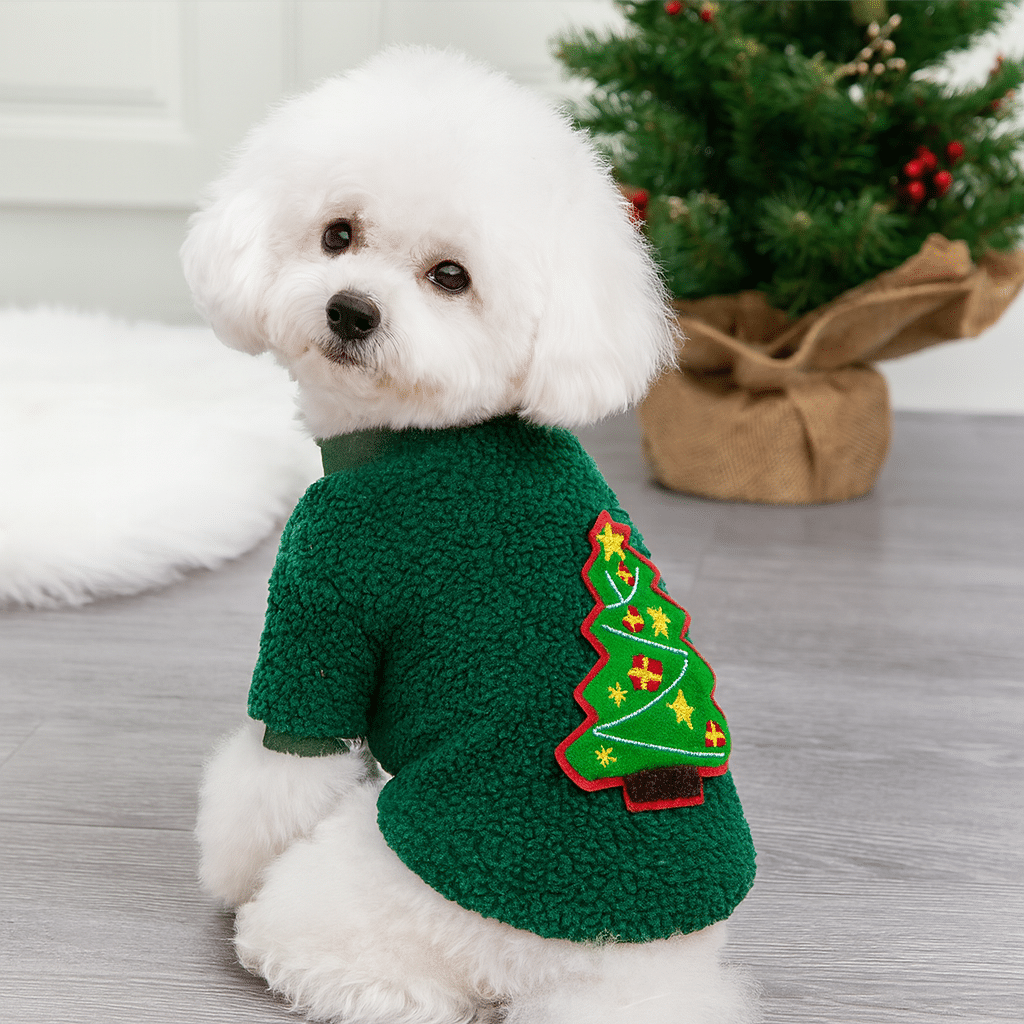 Ce pull de noël sapin pour spitz transforme votre petit compagnon en véritable star des fêtes de fin d’année. Le motif sapin brodé sur le dos attire tous les regards avec ses détails colorés et ses petites décorations qui rappellent un vrai arbre de Noël.