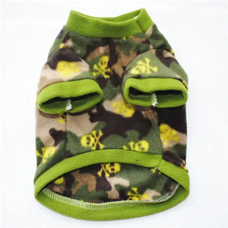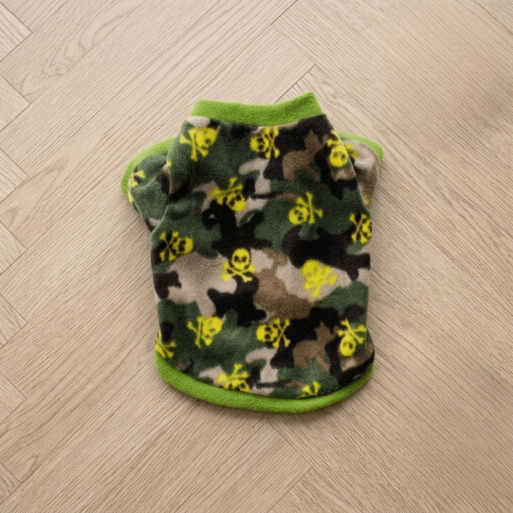 Le motif camouflage militaire orné de têtes de mort jaunes donne un style rebelle et original à votre chien, parfait pour les maîtres qui aiment les looks décalés.