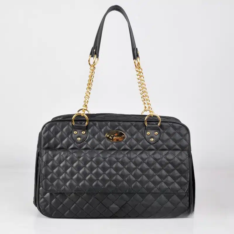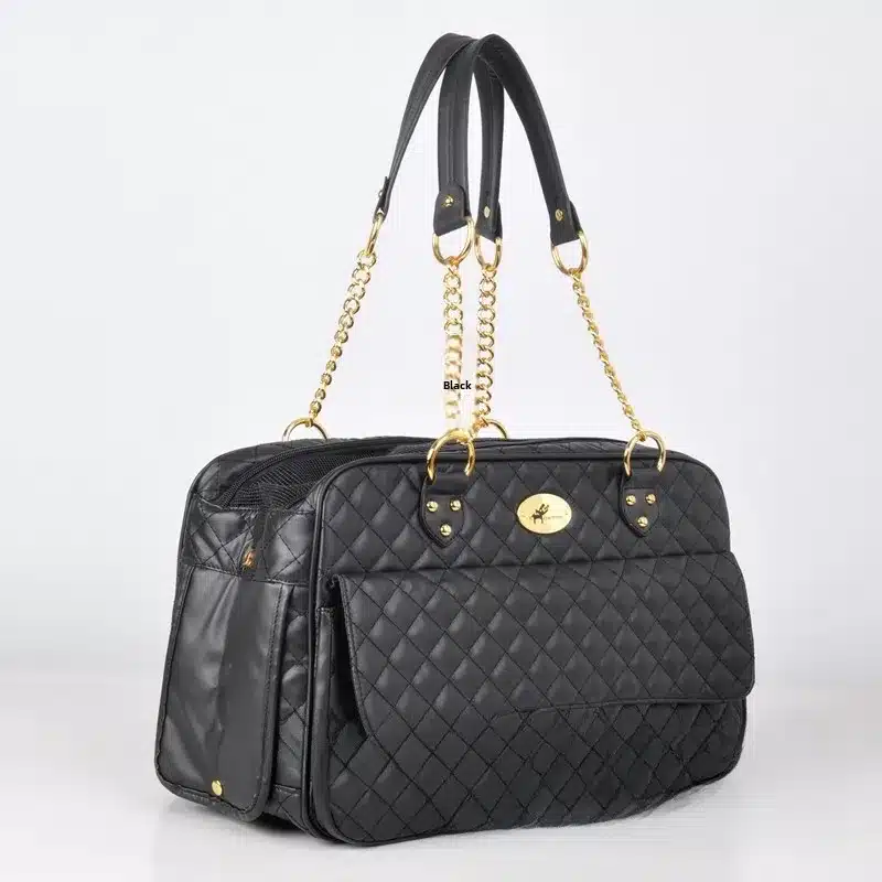 Ce sac de luxe en cuir noir chihuahua présente un design matelassé élégant qui allie style et praticité pour transporter votre petit compagnon. Les doubles poignées renforcées permettent un portage confortable à la main, tandis que les chaînes dorées ajustables offrent la possibilité de porter le sac à l’épaule selon vos préférences.