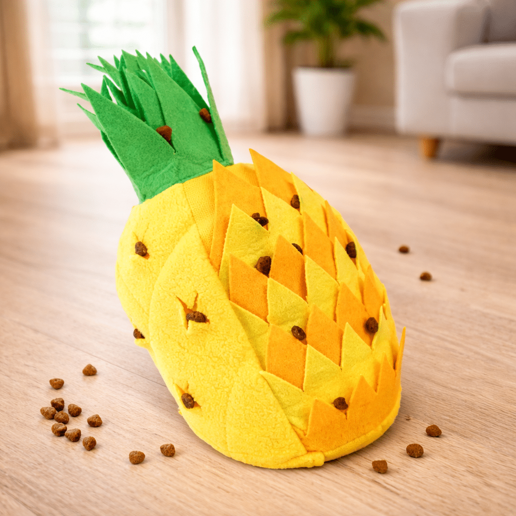 Ce tapis de fouille ananas chien transforme l’heure du repas en véritable jeu de recherche pour votre compagnon. Sa forme d’ananas avec des franges en tissu qui imitent parfaitement l’écorce du fruit crée de nombreuses cachettes où dissimuler les croquettes ou friandises.