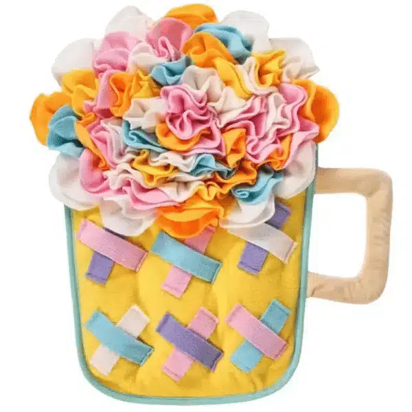 La forme de mug original avec sa poignée distinctive apporte une touche ludique à l’heure du repas tout en stimulant l’instinct de fouille naturel de votre petit chien. Votre animal devra utiliser son flair et sa patience pour dénicher chaque récompense cachée dans les plis du tissu.