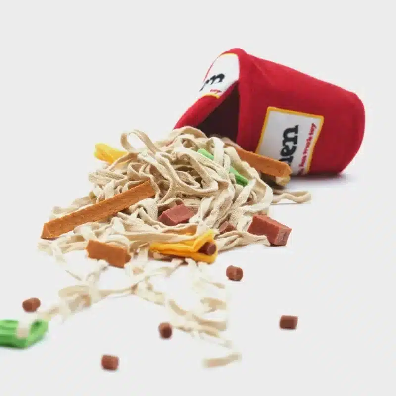 Ce tapis de fouille ramen pour chien reproduit fidèlement l’apparence d’un pot de nouilles instantanées avec son design amusant et original. Les longues bandes en tissu souple imitent parfaitement les nouilles et créent de nombreuses cachettes pour dissimuler les friandises de votre compagnon.