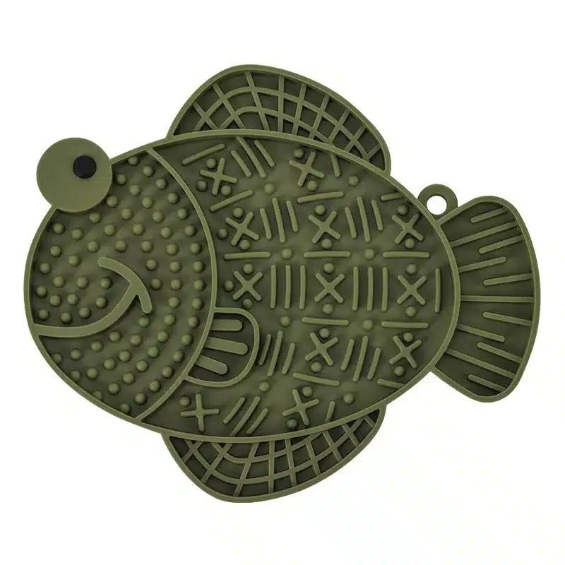 Ce tapis de léchage forme poisson vert pour chien présente une surface texturée avec des motifs géométriques et des reliefs qui stimulent naturellement l’instinct de léchage de votre compagnon. Les différentes zones offrent plusieurs textures variées : des petits picots sur la tête du poisson, des motifs croisés sur le corps et des rainures sur les nageoires qui maintiennent l’intérêt du chien pendant de longues minutes.