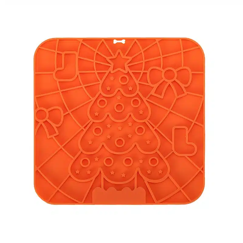 Ce tapis de léchage forme sapin orange pour chien présente un design festif original avec son motif de sapin de Noël décoré d’une étoile au sommet et d’un nœud cadeau sur le côté. La surface texturée avec reliefs variés offre différentes zones de léchage qui stimulent naturellement votre compagnon et l’aident à se détendre.