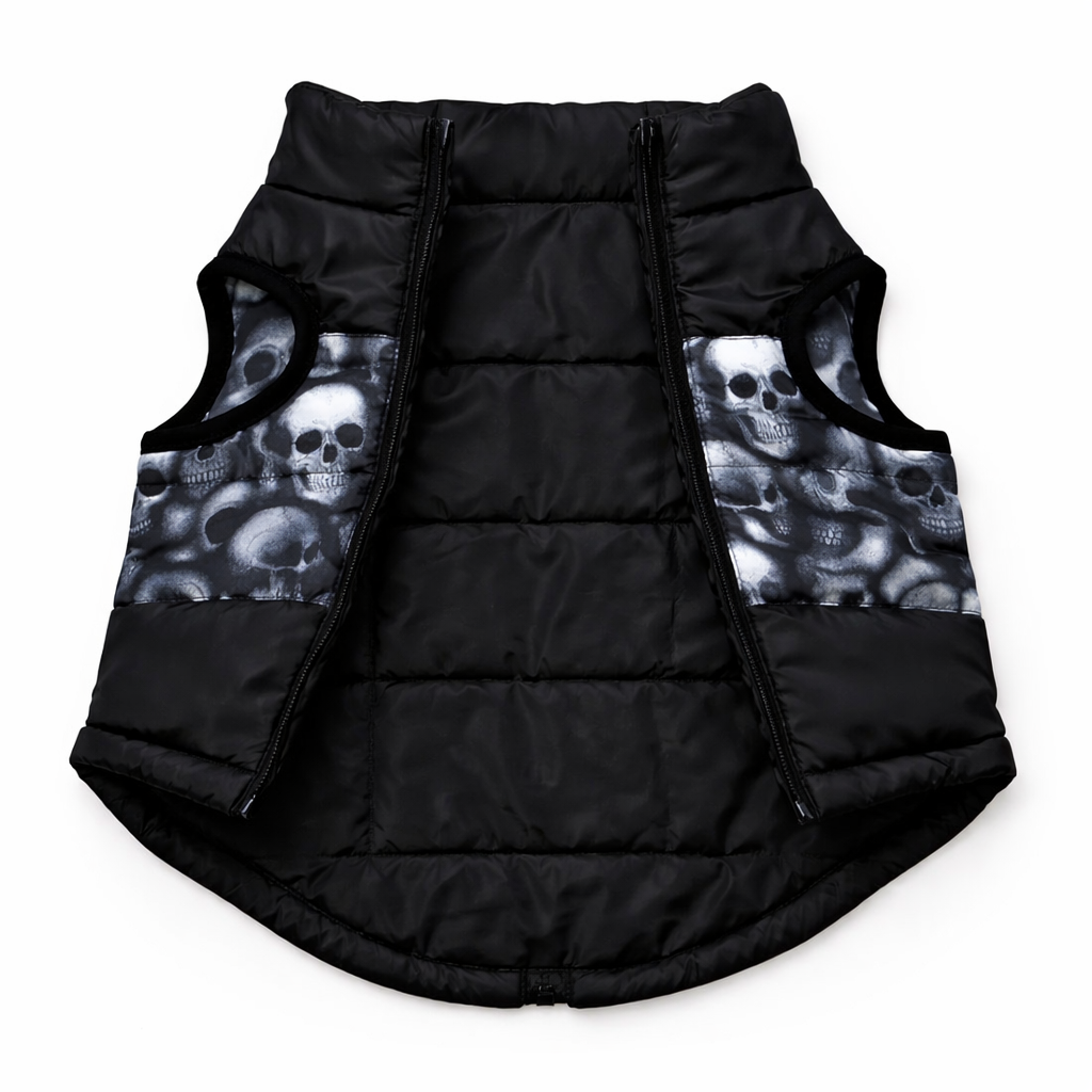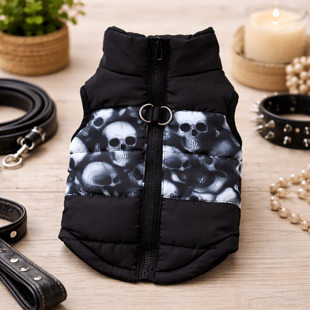 Le motif tête de mort original sur la partie centrale donne un style rock unique à votre petit compagnon, parfait pour se démarquer lors des sorties. Cette veste noir rembourrée pour petit chien combine protection thermique et look tendance pour les chiens qui aiment affirmer leur personnalité.